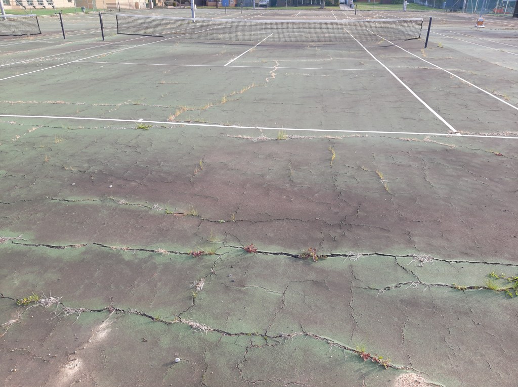 The concrete is crumbling, the green is almost faded away, on the right is where Netball was set up, the padding is old and faded.