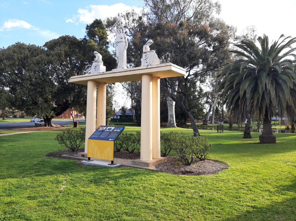 The Three Muses in Waring Gardens were originally on the now demolished School of Arts building in End Street; they were designed by Fred Harrison with the tender being put out in 1892 with Mr. S. A. MacFarland being chosen from twenty-three tenders.