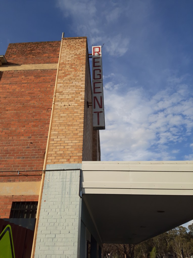 The Regent Theatre sign was on Town Hall before the Regent was moved to Edwardes Street; the building is now the Deniliquin Baptist Church.