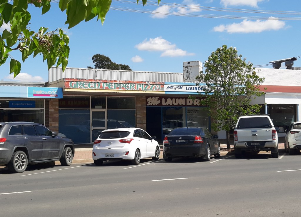 Signage from Green Pepper Pizza reappeared next to the Laundromat in Cressy Street after occupants in the present day moved out and removed their signage.